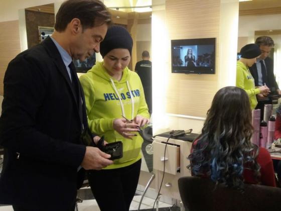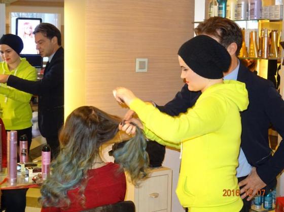 Hajas László mesterfodrász a belvárosi üzletében várta Dominikát, aki a kapott profi frizurakészítő eszközöket nyomban ki is próbálhatta: a mesterfodrász szakmai irányításával készíthette el egy csodalámpás önkéntes frizuráját.