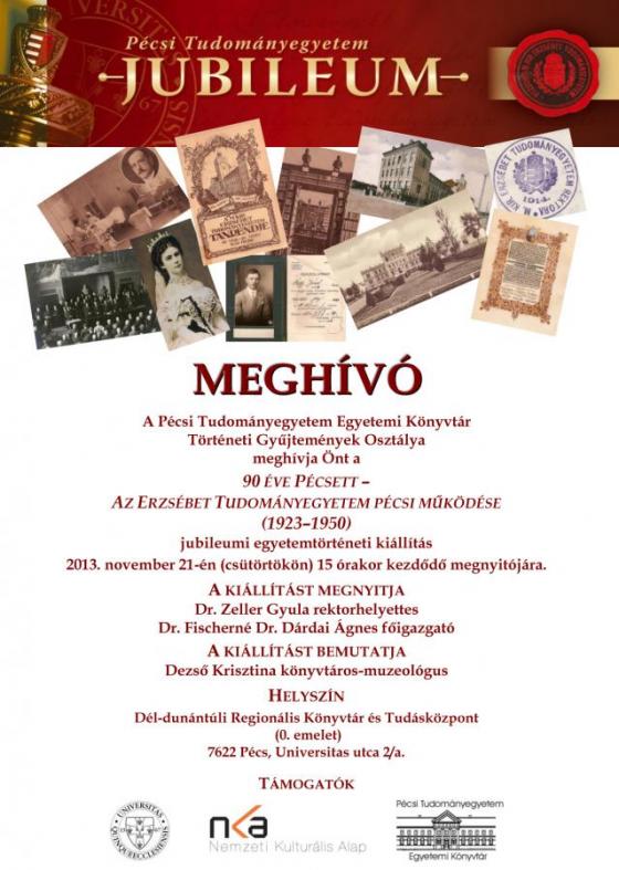 A Pécsi Tudományegyetem Egyetemi Könyvtár Történeti Gyűjtemények Osztálya meghívja Önt a 90 éve Pécsett - Az Erzsébet Tudományegyetem Pécsi működése (1923–1950) jubileumi egyetemtörténeti kiállítás megnyitójára.