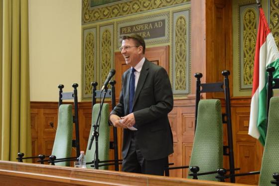 A brit nagykövet mindig vidám és humoros kijelentéseiről is híres, amelyek a keddi délutáni előadásról sem maradtak el. Előadását azzal kezdte, hogy elmondta Nagy-Britannia a brexit ellenére milyen értékekkel bír, mind gazdaságban, mind oktatásban (a 10 legjobb egyetem közül 4 az Nagy-Britanniában található), mind pedig a nemzetközi kapcsolatépítés terén, ahogy erre a brit-magyar kapcsolat vonatkozásában is felhívta a figyelmet. Magyarul üdvözölte az egybegyűlteket, majd magyarul is folytatta az előadását egy pár percig, aztán angolra váltott.