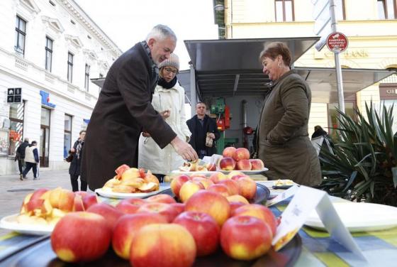 Az almavásár népszerűsítését már szerdán elkezdték a Kossuth téren, ahol termelők kínáltak ingyenes kóstolót a pénteken is pultokra kerülő fajtákból.