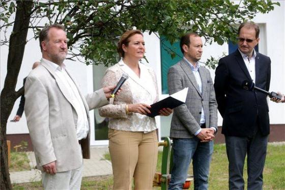 Kővári János, az alapítvány elnöke, Vitályos Eszter, az Emberi Erőforrások Minisztériumának európai uniós fejlesztéspolitikáért felelős államtitkára, Őri László, a Baranya megyei önkormányzat elnöke és Hoppál Péter, a Fidesz országgyűlési képviselője (b-j) a súlyosan-halmozottan sérült, értelmileg akadályozott és pszichés fejlődési zavarokkal küzdő gyermekek oktatását biztosító Kerek Világ Általános Iskola új épületrészének átadásán Pécsen 2021. június 2-án.
