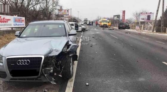 A fehér kisteherautó balra akart bekanyarodni. A mögötte közlekedő Audi már nem tudott megállni és hátulról neki csapódott. A kisteherautó az ütközés következtében a szembejövő sávba csúszott és ott frontálisan ütközött egy Volkswagennel. Az első információk szerint, az egyik autó utasa kirepült a gépkocsiból. Négy mentőautó érkezett a helyszínre. Végül egy súlyos és egy könnyű sérültet szállítottak el. A hatos utat teljes szélességében lezárták.