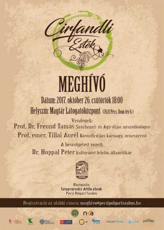 Legújabb rendezvénysorozatunkat a 2017-18- as évadhoz igazodóan Pécsett „ Pécsi Cirfandli esték” címmel, havi rendszerességű beszélgetés-sorozat formájában indítjuk el. A meghívott Kossuth-díjas művészekkel (esténként két-két eltérő művészeti ágban alkotó vendéggel) egy pohár pécsi cirfandli mellett Dr. Hoppál Péter kultúráért felelős államtitkár, Pécs országgyűlési képviselője beszélget, közelebb hozva emblematikus művészeinket a személyesség varázsán keresztül a kultúrakedvelő polgári közönséghez."