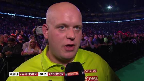 Az utolsó legben 180-at dob Anderson hátsó pályáról de utána tripla nélküli kör jön. 90-ről nem tud kiszállni Gerwen, Anderson majdnem megcsinálja a 161-et de mégsem és végül Gerwen 10-7-re nyer és bejut a döntőbe. A vártnál egy kicsit simább lett a vége és nem is lett olyan szoros.