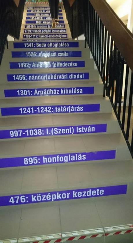 A közösségi oldalon terjedő kép szerint az iskola lépcsőit matriázták fel a legjelesebb, többnyire a magyar történelemben fontos dátumokkal, így a diákok naponta akár többször is találkozhatnak ezekkel. Persze valamennyi fontos történelmi dátumhoz Bábel Tornya, vagy az Empire State Building valamennyi lépcsője is kevés lenne - meg persze ki akarna naponta annyi lépcsőt megmászni -, de a kezdeményezés mindenestre ötletes, remélhetőleg a sásdi diákok érdemjegyei ugrásszerűen javulnak történelemből. Aztán persze az is lehet, hogy néhány hét múlva a legfontosabb matematikai, fizikai, kémiai képletekkel, a szorzótáblával, jeles szerzők jeles műveivel, vagy éppen az angol igeidőkkel cserélik fel a feliratokat, attól függően, melyik tárgyból gyengélkednek leginkább a sásdi tanulók.