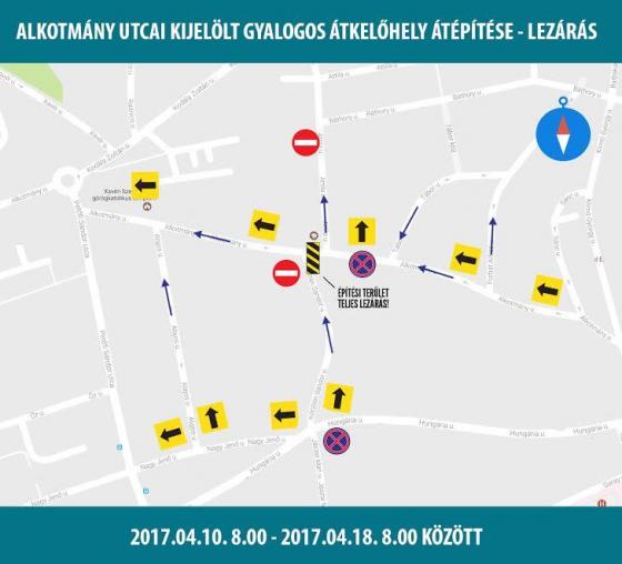 A gyalogos-átkelőhely átépítésének és az ideiglenes forgalmi rend bevezetésének kezdete 2017. április 10. 8:00 óra, mely 2017. április 18. 8:00 óráig tart majd.