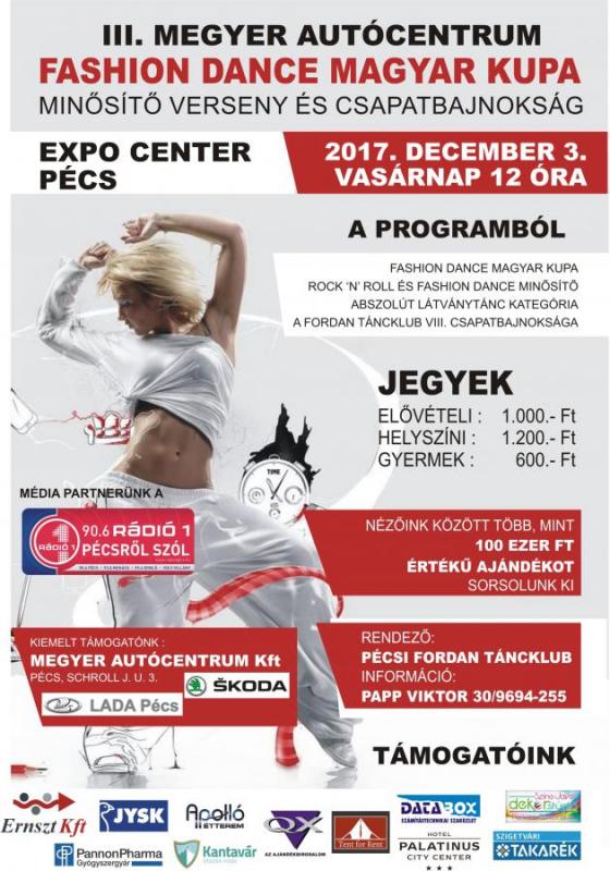 Ismét közönségcsalogató táncversenyt rendez december 3-án, vasárnap 12 órától a Pécsi Fordan Táncklub az Expo Centerben. A III. Megyer Autócentrum Fashion Dance Magyar Kupa, Minősítő Verseny és Csapatbajnokság a klub visszatérő rendezvénye, több, mint 10 éve rendezik évente két alkalommal.