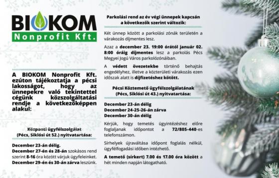 A BIOKOM Nonprofit Kft. ezúton tájékoztatja a pécsi lakosságot, hogy az ünnepekre való tekintettel cégünk közszolgáltatási rendje a következőképpen alakul: