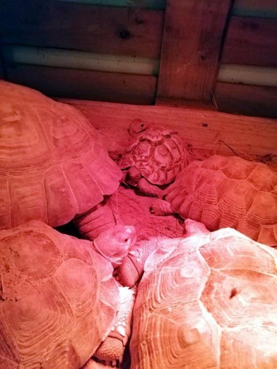 A másik meglepetés később érkezett, amikor a kis gyöngytyúk elkezdett növekedni és felfedezni környezetét. Az infralámpával ellátott láda, ahol eddig élt, hamar alacsonynak bizonyult számára. Megtanulta, hogy kirepülhet belőle, és a “földszinti” részen élvezheti a szárazföldi teknősök társaságát. A csibe egyfajta Maugliként élt a lomha páncélosok között: közöttük aludt az infralámpa alatt, és amikor a teknősök megkapták ebédjüket, velük együtt evett. A gyöngytyúk, aki szárazföldi teknősnek képzeli magát, hamar kinőtte korábbi, alacsony otthonát. Jelen pillanatban is ugyan ebben a látogatók elöl elzárt helyiségben él, azonban időközben egy tágasabb röpdébe költözött. A -valószínűleg kakas-csibe jövő tavaszig itt fog cseperedni, utána terveink szerint visszaszoktatjuk fajtársai közé, az Afrika-kifutóba a “kis Mauglit”.