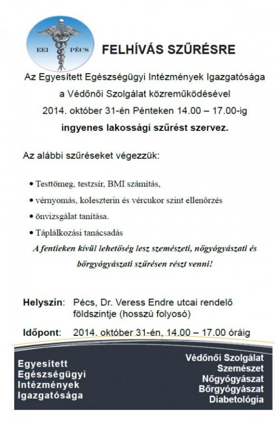 Az Egyesített Egészségügyi Intézmények Igazgatósága és a Védőnői Szolgálat október 31-én ingyenes lakossági szűrést szervez.