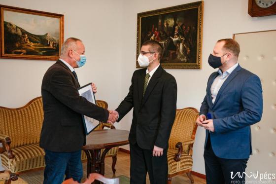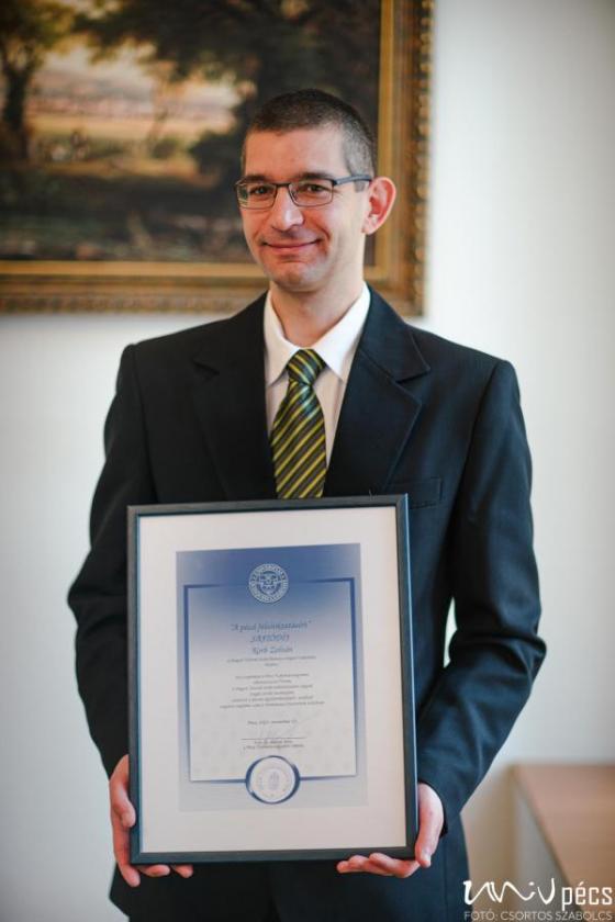 Az elismeréssel járó oklevelet és a PTE címerével ellátott aranykitűzőt Miseta Attila, a PTE rektora és Decsi István kancellár adta át a PTE Rektori Tanácstermében.