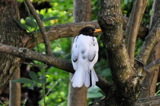 A Duna-Dráva Nemzeti Park Igazgatóság Tettye Oktatási Központja körül, az igazgatóság parkolójában és a Pintér-kertben a szerencsések által megfigyelhető madár első pillantásra egyáltalán nem emlékeztet fekete rigóra. Bár a feje a megszokott sötét fekete, a teste többi részét borító tollak nagy része fehér, így beazonosítani inkább a jól ismert „rigós” mozgásáról lehet. A furcsa színezet valószínűleg a fajtársakat, és más fajokat is zavarja, mivel többször tapasztalható volt, hogy zargatták, kergették a fekete csuklyás „Hófehérkét”, akinek a feltűnő tollazata miatt eleve nehezebb feladat a rejtőzködés megoldása.