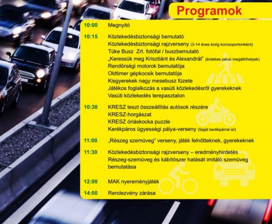 A programok között közlekedésbiztonsági bemutató, rendőrségi motorok bemutatója, KRESZ horgászat, kerékpáros ügyességi pálya-verseny, részeg-szemüveg és kábítószer hatását imitáló szemüveg bemutatása színesíti a rendezvényt. A Tüke Busz Zrt. Volvo autóbusz bemutatója mellett a „Keressük Krisztiánt és Alexandrát” játékban érdekes elnevezésű pécsi megállóhelyeket kereshetnek vaktérképen az érdeklődök. Rajzversenyek és gyerekprogramok, valamint Tüke Busz fotófal teszik élvezetessé és érdekessé a vasárnapi közlekedéskultúra jegyében zajló programot.