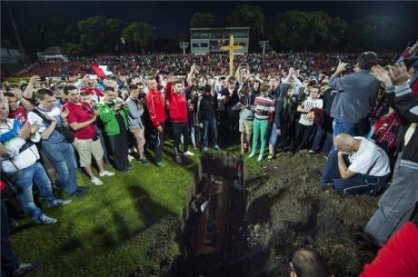 A szünetben kikerült a pálya mellé egy koporsó, amely jelképesen a pécsi futballt temette...