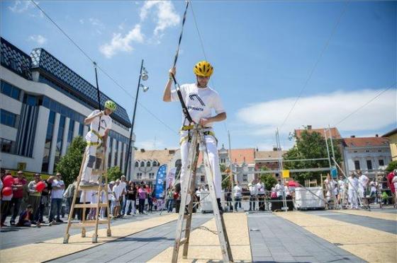 A III. Létravágta előfutamát tartották meg a pécsi Kossuth téren. Az ügyességi verseny lényege, hogy a résztvevők festőlétrával lépegetve igyekeznek előbb végig érni a 12 méter hosszú pályán.