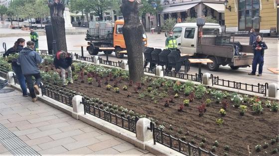 Újabb színek kerültek a város főterére: a BIOKOM NKft. munkatársai 1500 egynyári virágot ültettek a meteorológiai állomás melletti ágyásokba.