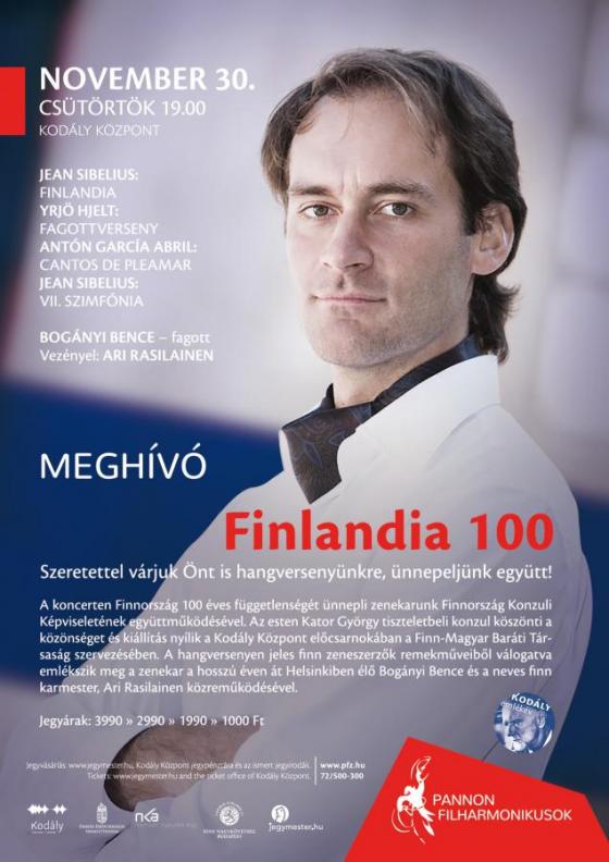 A Pannon Filharmonikusok ugyanezen a napon 19.00 órakor kezdődő, Jean Sibelius és más jeles zeneszerzők műveiből összeállított, FINLANDIA 100 c. hangversenyével köszönti a Kodály Központban a függetlenségének 100. évfordulóját ünneplő Finnországot.