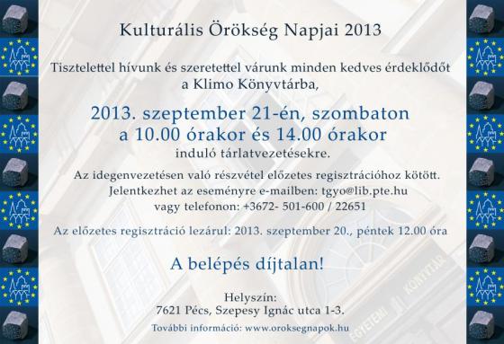 A programon való részvétel ingyenes, de előzetes regisztrációhoz kötött. Regisztráció 2013. szeptember 20., péntek 12 óráig e-mailben: tgyo@lib.pte vagy telefonon +36 72 501 600/22651.