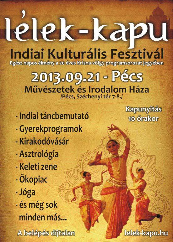 LÉLEK-KAPU Egész napos indiai kulturális fesztivál A rendezvény 10:00 órakor kezdődik. Helyszín: Művészetek és Irodalom Háza http://www.pecsprogram.hu/program/LELEK-KAPU/2013-09-21/10:00 |