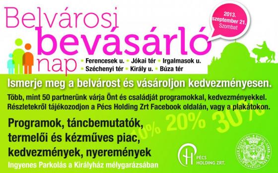 Meghosszabbított nyitva tartás, kedvezmények, kóstolók, ingyenes parkolás - A Pécs Holding Zrt. 2013. június 08-án Belvárosi Bevásárló Napot rendez a belvárosban. A programhoz csaknem 70 üzlet csatlakozott, a cél, hogy minél többen megismerjék a belvárosi üzletek, vendéglátóhelyek kínálatát.