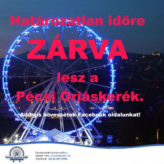 A járványhelyzetre való tekintettel a Hungary Diamond Wheel tulajdonos-üzemeltetője úgy döntött, hogy 2020. november 16. Hétfőtől a Pécsi Óriáskereket, határozatlan időre bezárja - írja Facebook oldalán az üzemeltető.