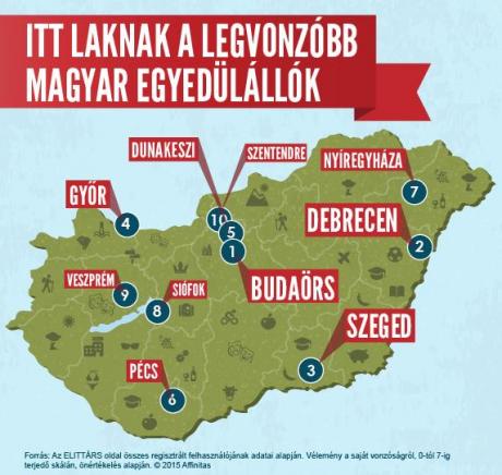 Saját vonzóságukról is vallanak az ELITTÁRS társkereső tagjai, amikor regisztrálnak az oldalra és kitöltenek egy átfogó személyiségtesztet. Az egyedülállók egy nullától hétig terjedő skálán értékelik kisugárzásukat, ezek az adatok segítenek most megfejteni, hol találhatók a legelbűvölőbb magyarok. A budaörsi egyedülállók a legbiztosabbak a vonzóságukban, ők kerültek a dobogó legfelső fokára a hazai városok közül, őket Debrecen követi a lista második helyén, a bronzérmes Szeged, a negyedik pedig Győr a sorban. Az ötödik legvonzóbb város címet egy másik főváros közeli agglomerációs település, Dunakeszi nyerte.