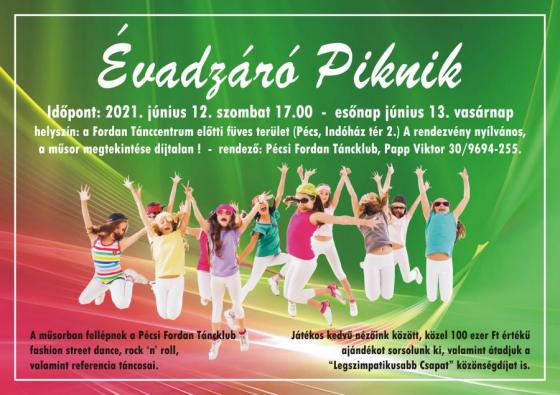 2021. június 12-én, szombaton 17.00 órakor „Évadzáró Piknik” elnevezésű rendezvényünkkel méltó módon szeretnénk elköszönni az első féléves szezontól és szeretnék bebizonyítani, hogy a nehéz időszakban is lehetett színvonalas produktumokat létrehozni. Ezúttal nem zárt térben, hanem a szabadban, az új Fordan Tánccentrum (Pécs, Indóház tér 2.) előtti füves területen fognak táncolni a fordanos fiatalok.