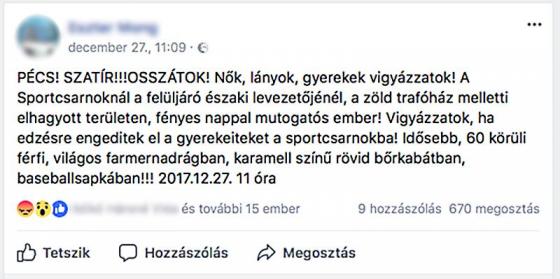 Egy nő a Facebookon figyelmezteti az ismerőseit, hogy vigyázzanak a Sportcsarnok környékén, mert egy férfi fényes nappal mutogatja magát. Azt írja a posztban, hogy “a zöld trafóház melletti elhagyott területen” garázdálkodik a 60 körüli mutogatós.