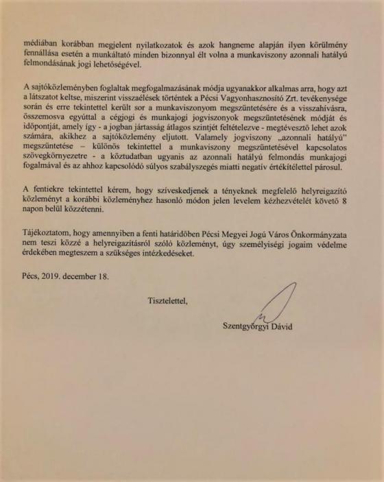 A Pécsi Vagyonhasznosító volt vezérigazgatója levélben szólította fel Péterffy Attila polgármestert, hogy az önkormányzat által a visszahívásáról kiadott sajtóközleménnyel kapcsolatosan helyreigazító sajtóközleményt adjon ki. A hozzánk is eljuttatott levelet változtatások nélkül mutatjuk be.