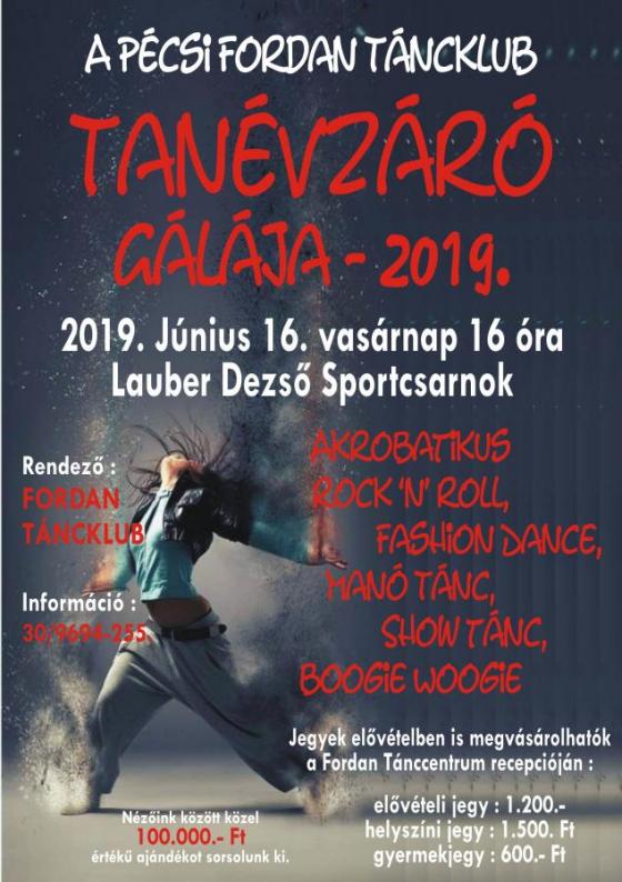 A Fordan Táncklub Tanévzáró Gálája két részből fog állni, 1 – 1 rész kb. másfél órás lesz. A gálán összesen közel 300 táncos 50 produkciója fog bemutatkozni. Fellépnek az akrobatikus rock ’n’ roll párosok és leányformációk minden korosztályban, bemutatkoznak a Fashion Dance csoportok, valamint a klub referencia táncosai, akik az elit vonalat képviselik. A gála legifjabb szereplői a manó tornások és a mini rocky-sok lesznek, akik nagyrészt a 4-6 éves korosztályt képviselik, a Retro Táncműhely férfi boogie woogie táncosa pedig túl van már az 5. ixen is. A színes tánc kavalkádban várhatóan mindenki megtalálja a számára legkedvesebb táncműfajt, vagy éppen tánccsoportot. A fellépés után minden táncos színes emléklapot kap. A műsorszámok a Pécsi Fordan Táncklub 15 oktatójának, edzőjének és asszisztensének munkáját dicséri.