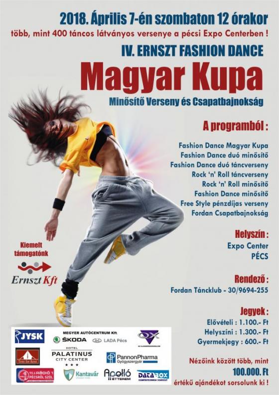 Ismét közönségcsalogató táncversenyt rendez április 7-én, szombaton 12 órától a Pécsi Fordan Táncklub az Expo Centerben. A IV. Ernszt Fashion Dance Magyar Kupa, Minősítő Verseny és Csapatbajnokság a klub visszatérő rendezvénye, több, mint 10 éve rendezik évente két alkalommal.