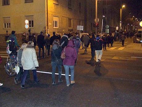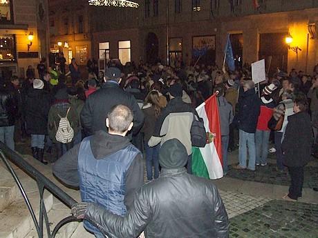 A Király utcán kétszázötven méteres sorban menetel a tömeg, az oszlop eleje este hét körül érte a Széchenyi István Gimnáziumot. A "Demokráciát!" felkiáltás mellett "Európa, Európa! is hallatszik. A demonstrálók a magyar mellett EU-s zászlót is lengetnek.