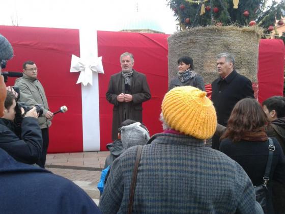 „Két ajándékot is hozott ma a Mikulás a pécsieknek, az egyik a 400 új munkahelyet teremtő elektronikai gyártó cég, a Jabil, a másik pedig itt van mögöttem!”- jelentette be Páva Zsolt a Széchenyi téren.