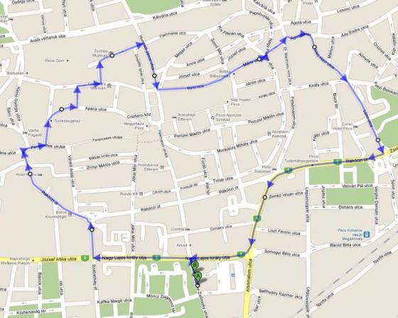 A Széchenyi téren nem megy keresztül, a Hunyadi utcán és több kisebb utcában lesz megállója a kifejezetten belvárosi közlekedésre szánt autóbuszoknak. A 44-es járat a Vásárcsarnoktól - Vásárcsarnokig közlekedik majd, ez 20 perces menetidőt jelent. Zsolnay-szobor, Kórháztér, Szent István tér, Káptalan u., Széchenyi tér, Flórián tér, Ágoston tér, Búza tér, Rákóczy u. a köztes megálló nevek.