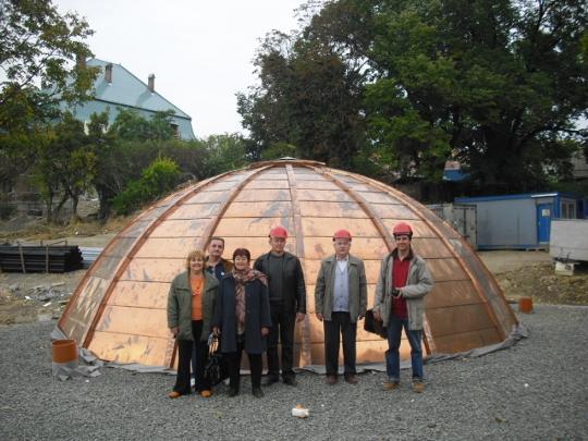 A kezdeményezők a planetárium kupolájának rézfedése köré csoportosulva |