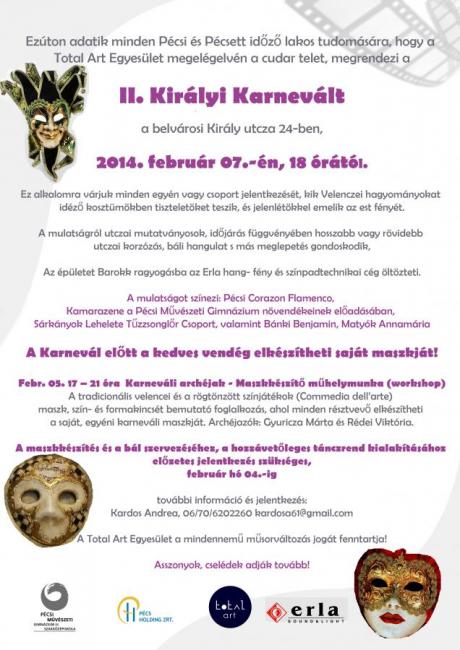 Ezúton adatik minden Pécsi és Pécsett időző lakos tudomására, hogy a Total Art Egyesület megelégelvén a cudar telet, megrendezi a II. Királyi Karnevált a belvárosi Király utcza 24-ben, 2014. február 07.-én, 18 órától.