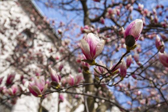 Virágzó tulipánfa (Liriodendron tulipifera) a pécsi MÁV Igazgatóság kertjében 2021. március 27-én.