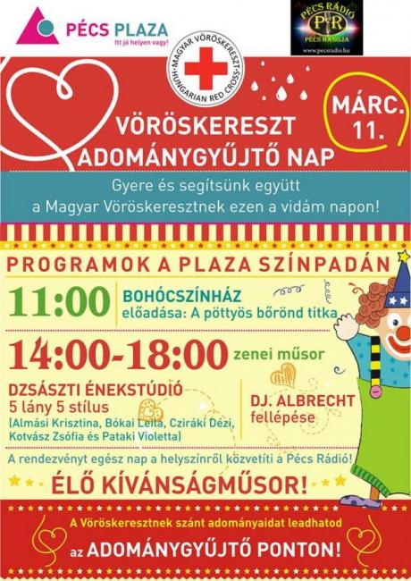 Szombaton a Pécs Plázában már délelőtt 11-kor elkezdődnek a délután hatig tartó programok, amelyek keretében a Vöröskeresztnek gyűjtenek adományokat.
